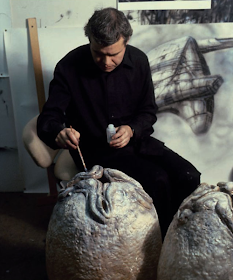 Ridley Scott, Les Dilley, and Ivor Powell come to inspect his work just as he stated to apply texture. The lid of the egg which in O'Bannon's sketch sprang open like a jack in a box, Giger transformed into an organic vaginal like opening. When he takes the plastic sheets in which his work is draped, there is a howl of laughter from the whole group. He had lovingly endowed the egg with an inner and outer vulva us made from clay covered in sausage skins layer around the pink aperture.